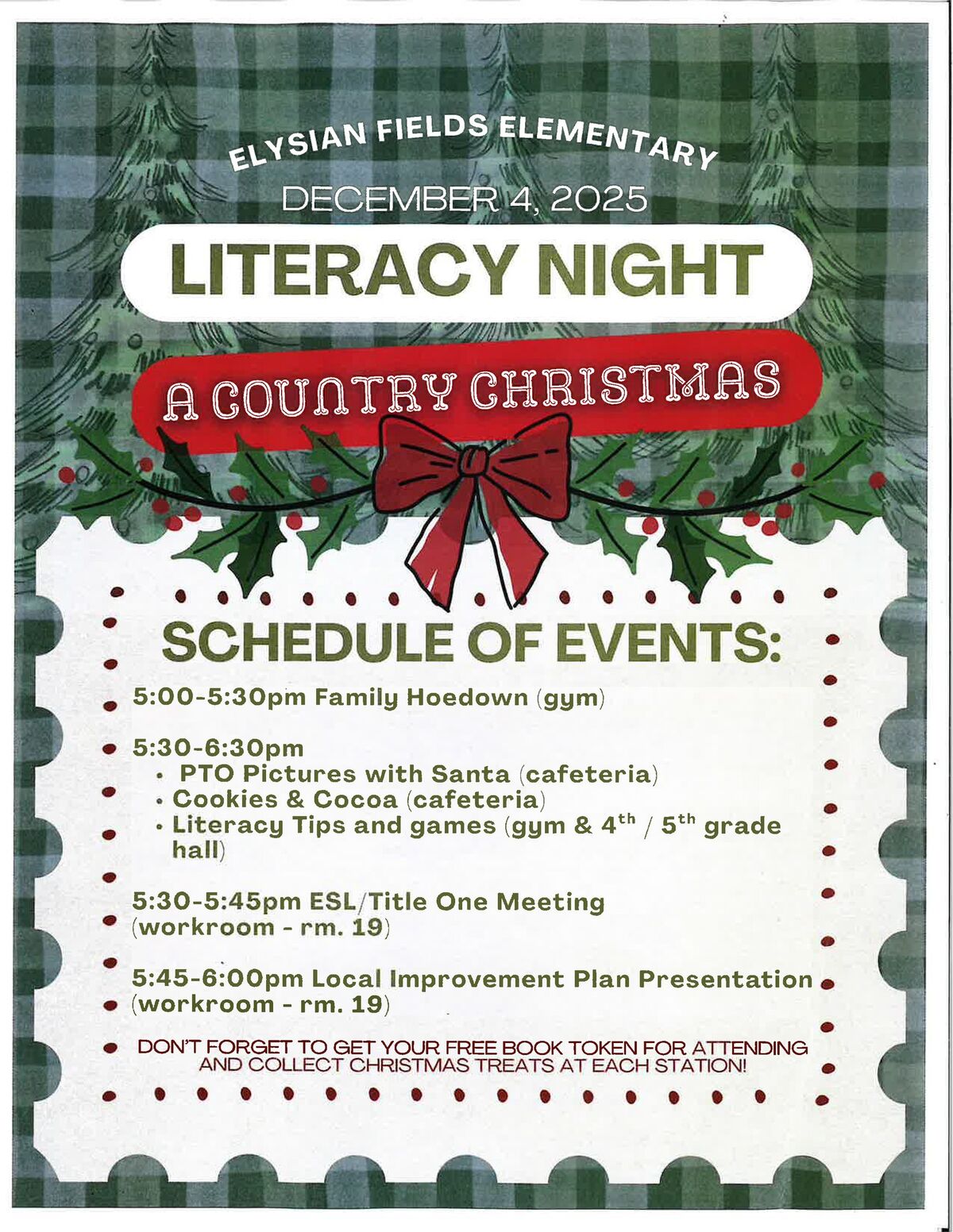 Elysian Fields Elementary invites all families to join us on Thursday, December 4, 2025, for a festive and fun-filled Literacy Night: A Country Christmas. This special evening will include activiti...
