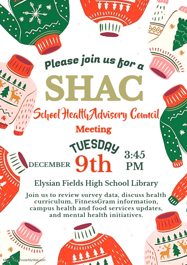 Elysian Fields ISD invites parents, staff, and community members to attend the upcoming School Health Advisory Council (SHAC) meeting on Tuesday, December 9th at 3:45 p.m. The meeting will be held ...